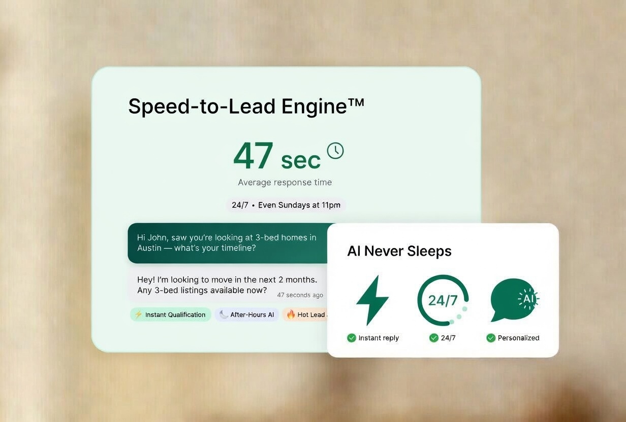 - Trained on 65,000+ real estate conversations, never sounds like a robot